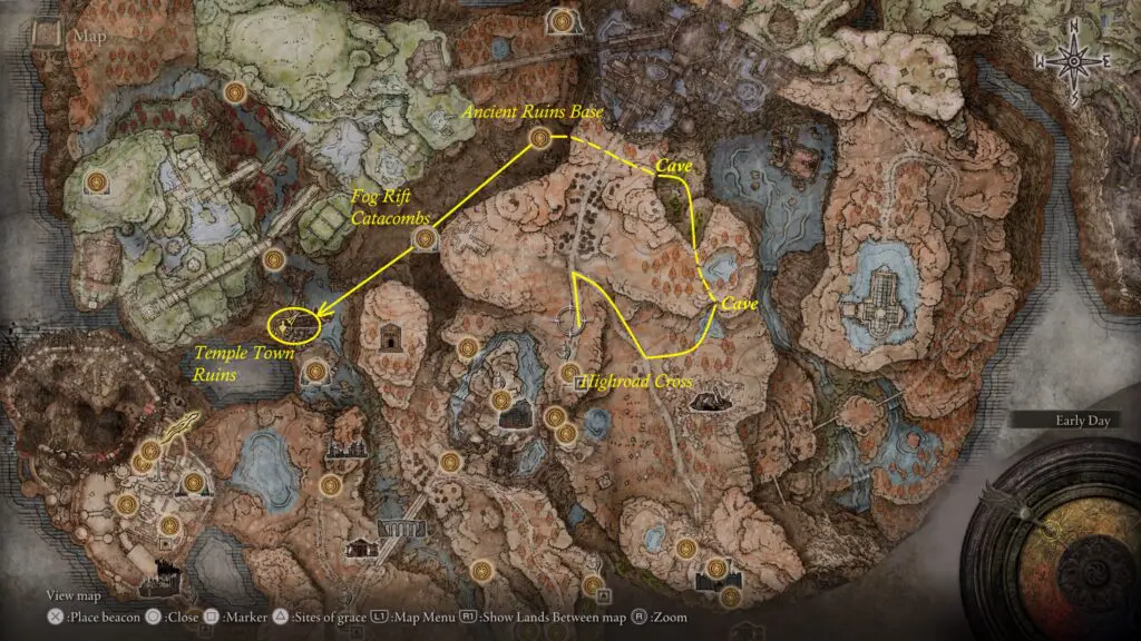 Start at the Highroad Cross Site of Grace and follow the path as shown in the map below. Go past the lake, and enter the cave. Go through the cave and head northwest to find another cave that leads to the Ancient Ruins Base Site of Grace.