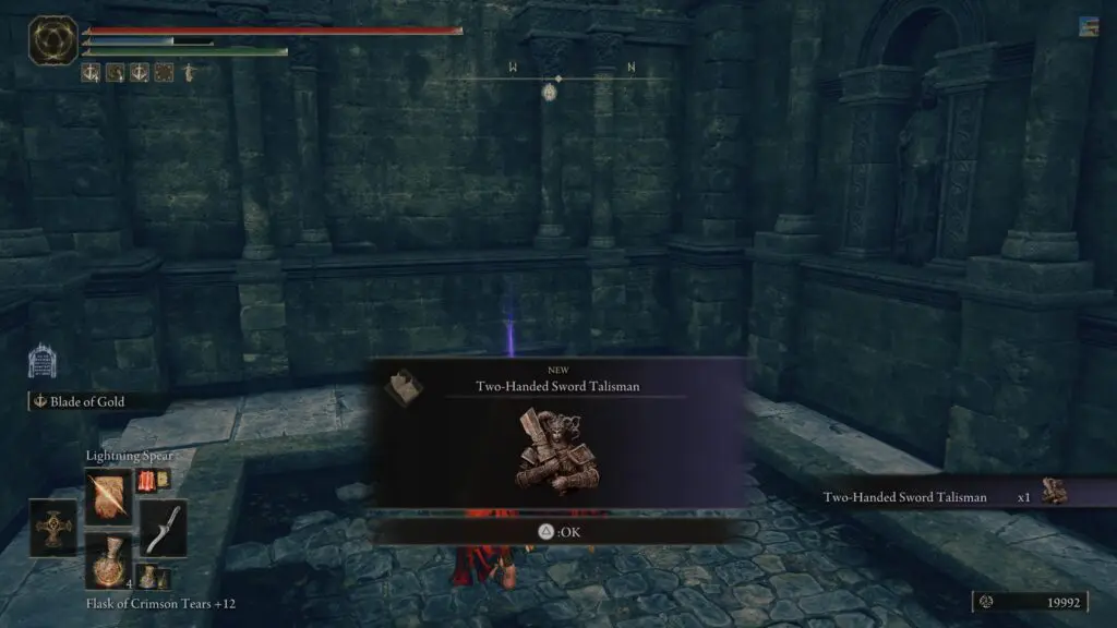After defeating the enemies, continue up the stairs into the room at the highest point of the structure. There you’ll find a chest containing the Two-Handed Sword Talisman.