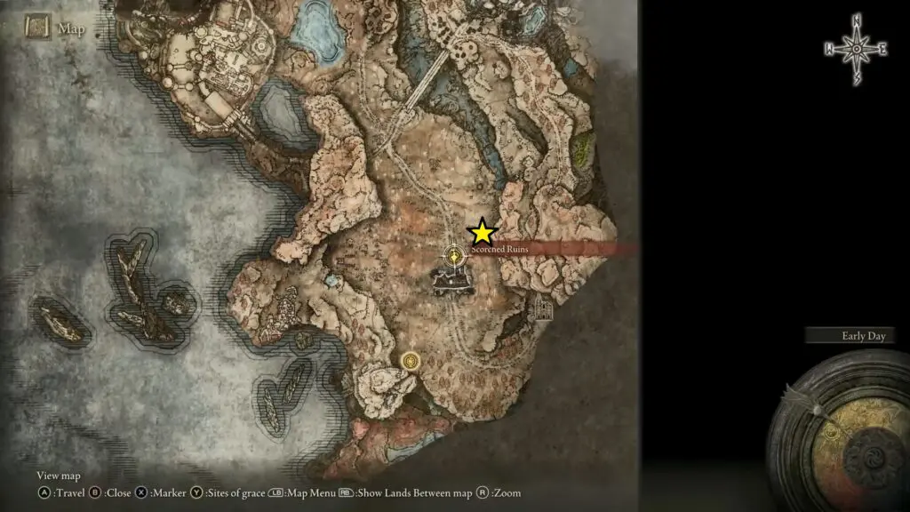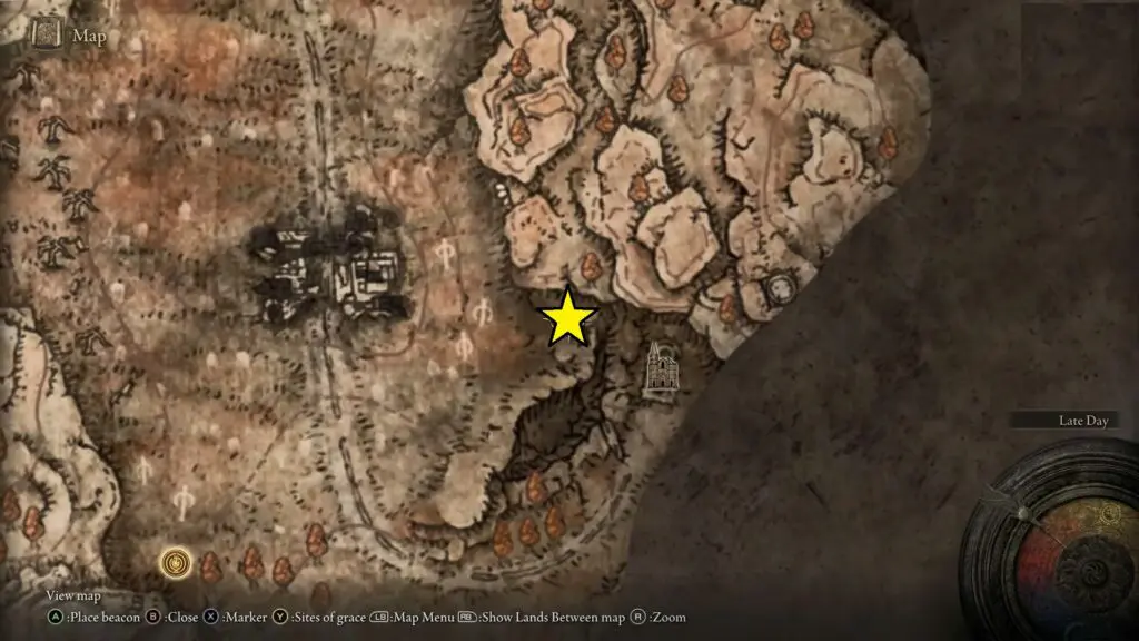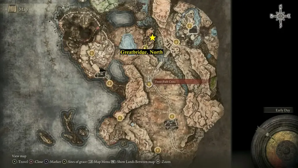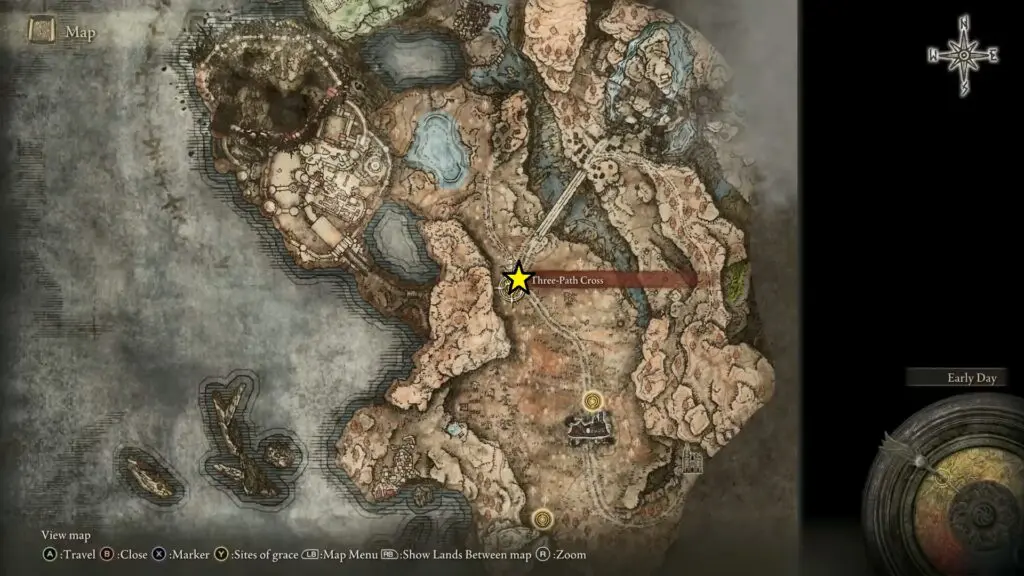 Head west from the Three Path Cross Site of Grace to reach the Main Gate Cross Site of Grace. You can find the next scatter tree fragment near Miquella’s Cross.