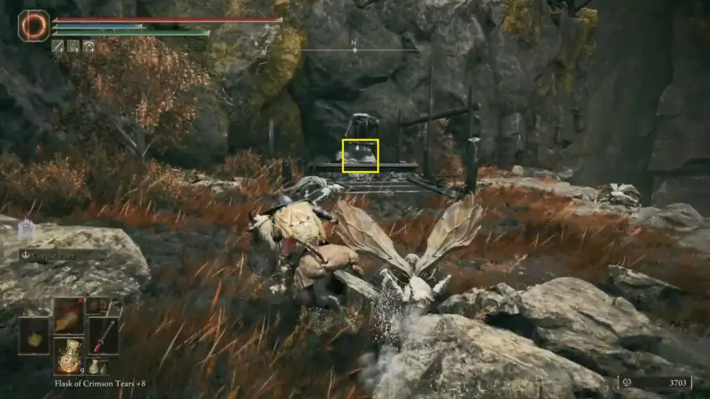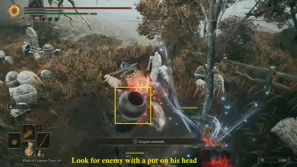 From the site of Grace called Scorched Ruins, look directly to the east. You’ll see a tree with a cemetery behind it. Go into the cemetery, and you’ll notice that one of the enemies has a pot above their head. Defeat the enemy before he runs away to get the scatter tree fragment.