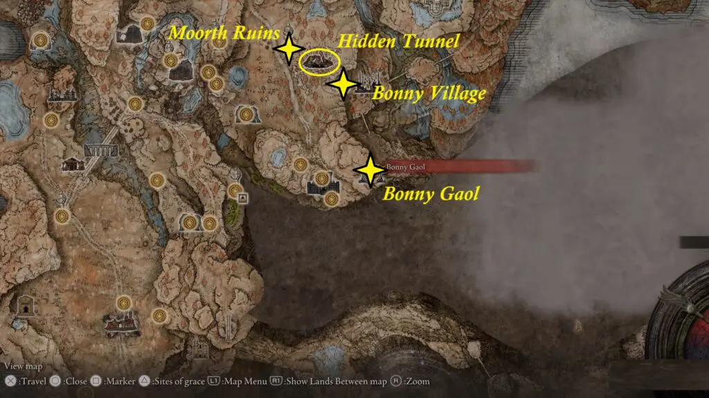 First, go to the Moorth Ruins, which is southeast of the Moorth Ruins site of Grace location. There you will find a secret tunnel leading to Bonny Village.