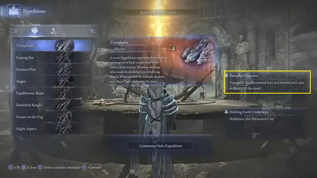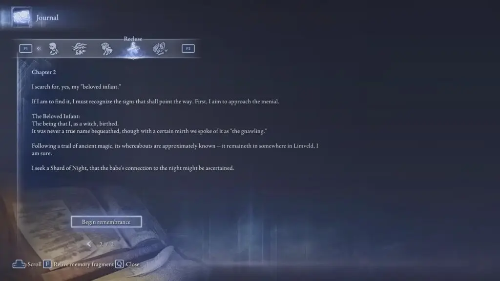 First, the player needs to either defeat any Nightlord or play enough Expeditions with the character Recluse until they collect enough Memory Fragments. Once you have gathered the required fragments, check your journal to unlock Chapter 2 and officially begin the Remembrance Quest