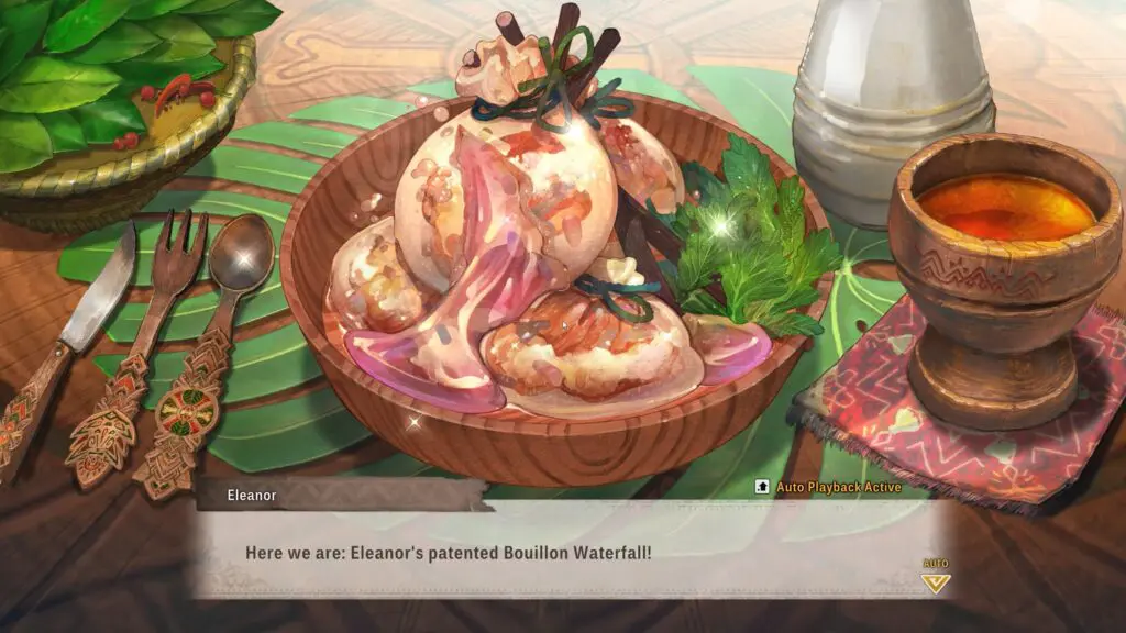 Once you have all three ingredients, return to camp. A cutscene will begin where Eleanor starts cooking, with help from the others. The quest ends on a warm note as she serves her special dish, Bouan Waterfall, to end the side story.