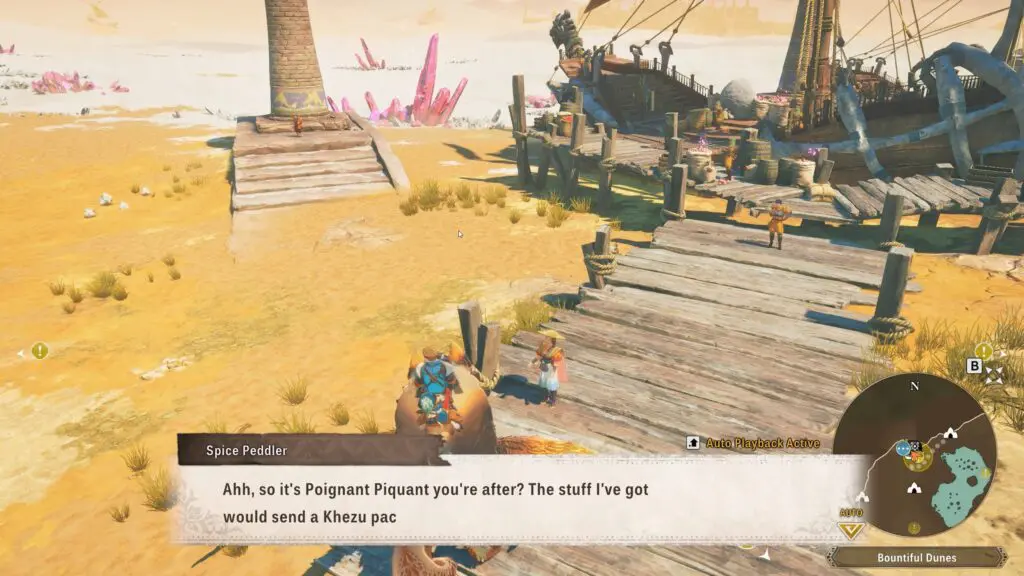 Poignant Pecan can be obtained from a spice merchant. Head toward Tarkan, checking common resting spots where travelers usually stop. Speak with the spice peddler near the boat to obtain Poignant Pecan.