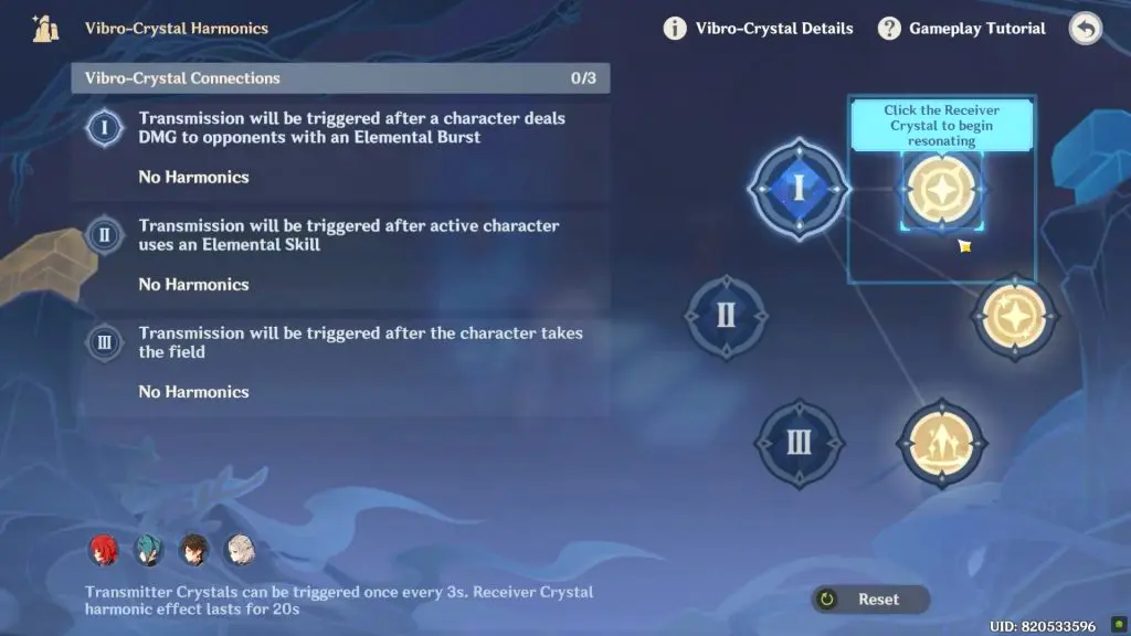 - After connecting Transmitter and Receiver Crystals, when the trigger conditions of the corresponding Transmitter Crystal is reached in the challenge, the buff effect of the corresponding Receiver Crystal can be obtained. Only the character that triggered the “Transmitter Crystal” will receive the buff effects.