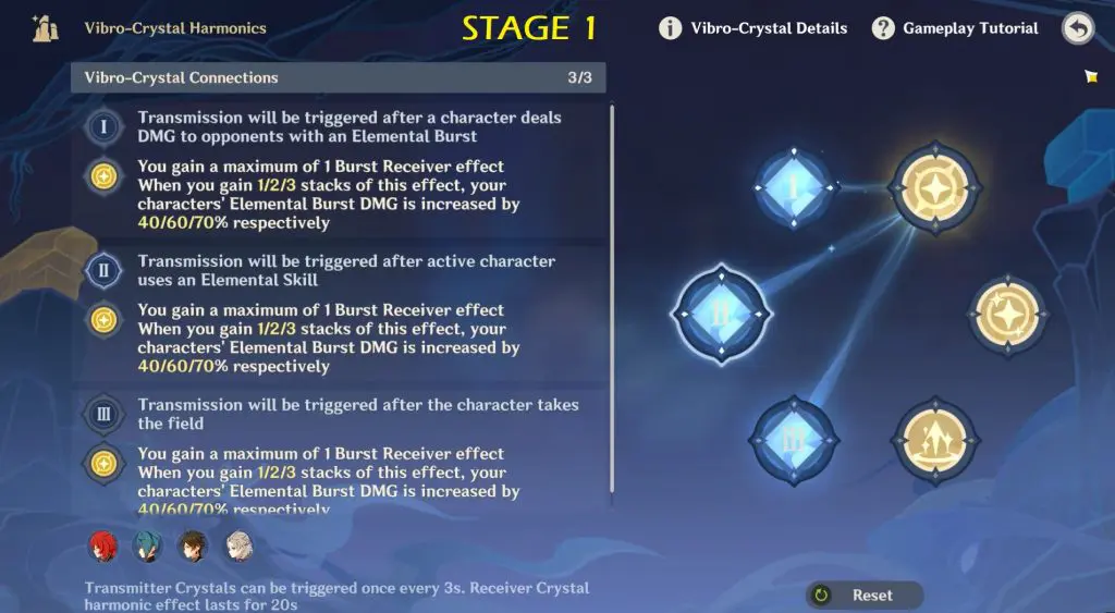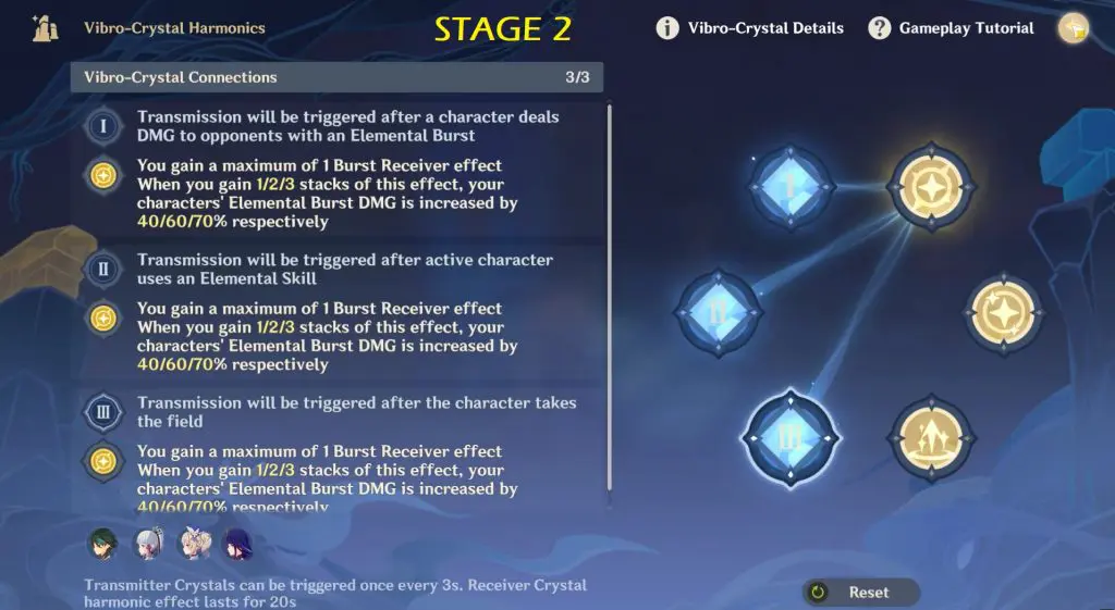 Receiver Crystals are the ones that give the buff once you’ve triggered them using the Transmitter Crystals. Various buffs will appear per stage as shown in below image.