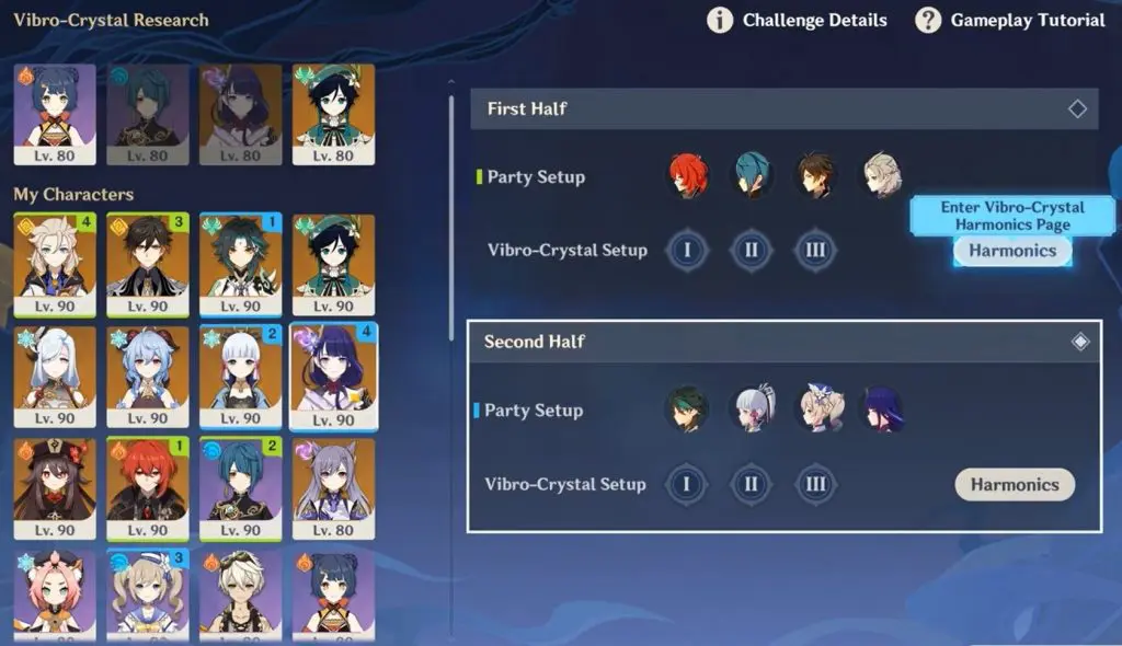 The challenges are split into a first half and a second-half. Here you need to set charcter for both the half. You can use characters provided by the event (trial character) or your own to form. Trial characters to use during the event, including are Venti, Raiden, Xiangling and Xingqiu.