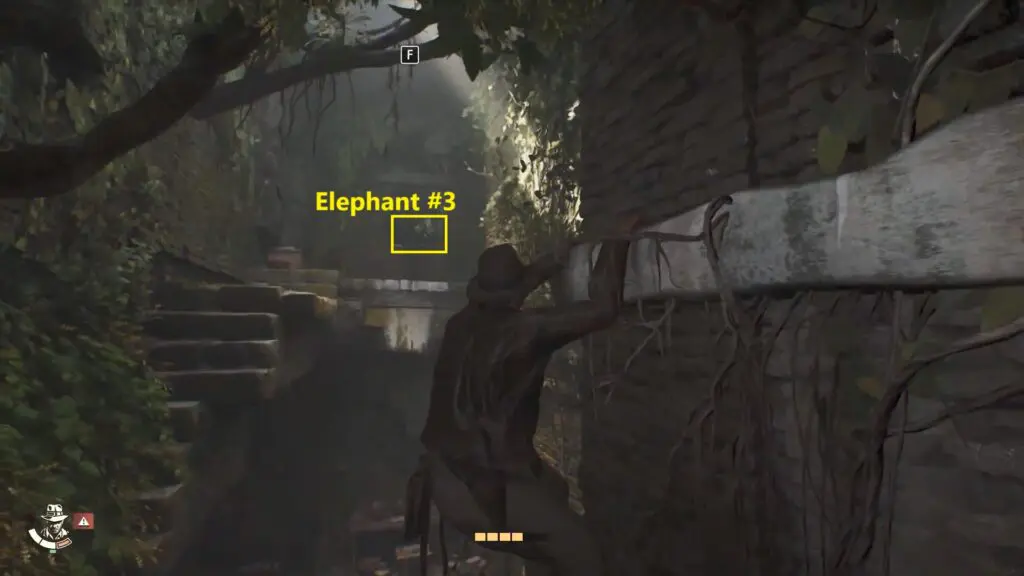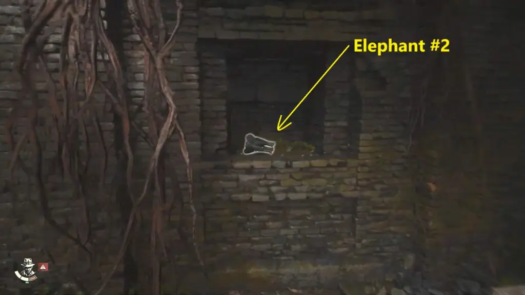 Go inside this door and proceed till the end. Look for a spot to climb on the right side opposite the broken stairs. Climb up and then use your whip to grab onto the swing point. Swing across to reach the top platform, where you’ll find the Elephant #3 Statue.