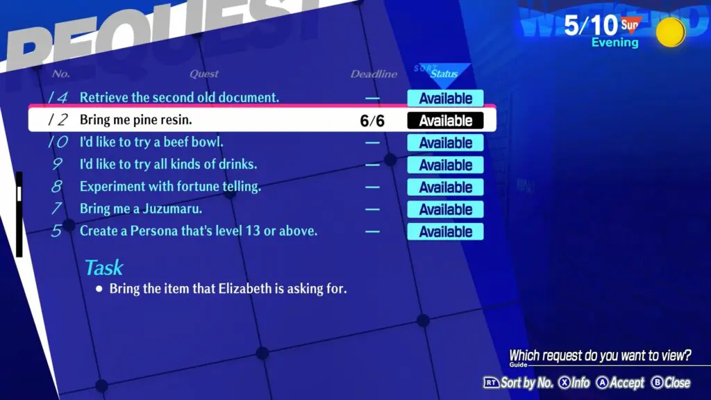 Accept Elizabeth Request 12: Bring me Pine Resin from Elizabeth in the Velvet Room.