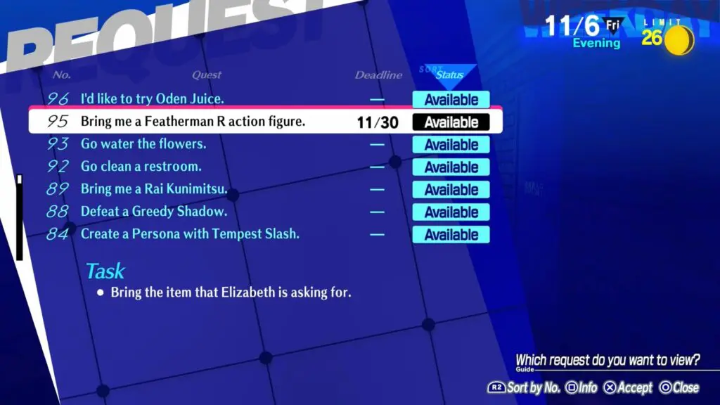 This article will explain how to complete Elizabeth Request 95: Bring me a Featherman R action figure in Persona 3 Reload. After defeating Full Moon Shadow, Elizabeth will give you a list of requests (optional). Completing these optional requests will provide you with rewards and cash.