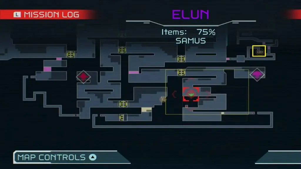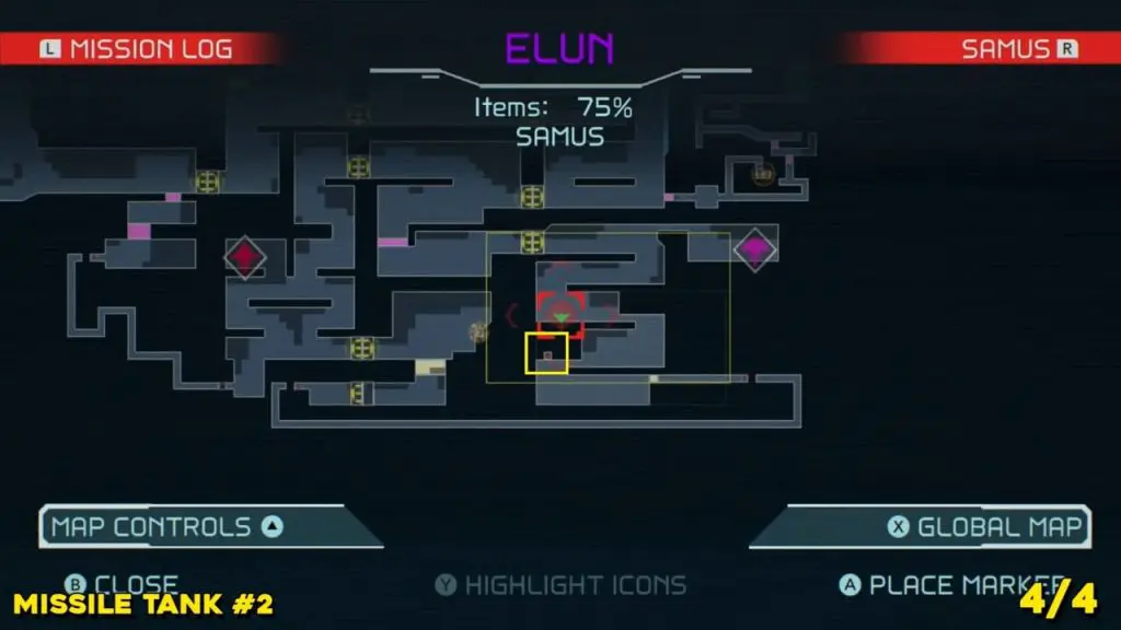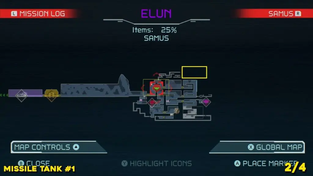 This first missile tank on Elun requires you to travel to the far north of the region, which we’ve highlighted in the map below. You’ll now need to make your way to the right side of the tunnel network. To make this one super simple, use your scanner to highlight blocks. Use a power bomb to clear the extreme right pathway so you can clamber up and collect the upgrade.