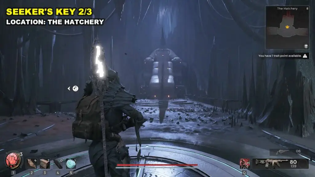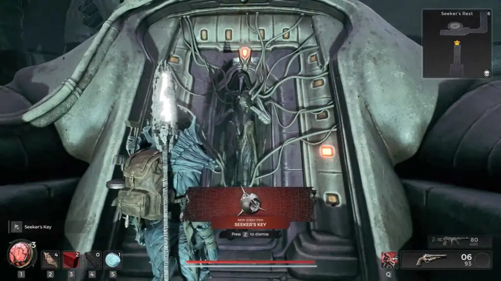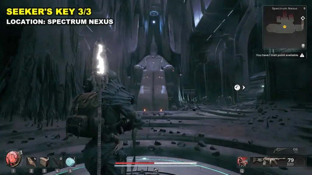 After killing Primogenitor, you can continue exploring the dungeon further, and go up the elevator to reach a tall stone-made statue. Go near the statue to reveal a set of stairs. Head upstairs and grab the Seeker’s Key #2.