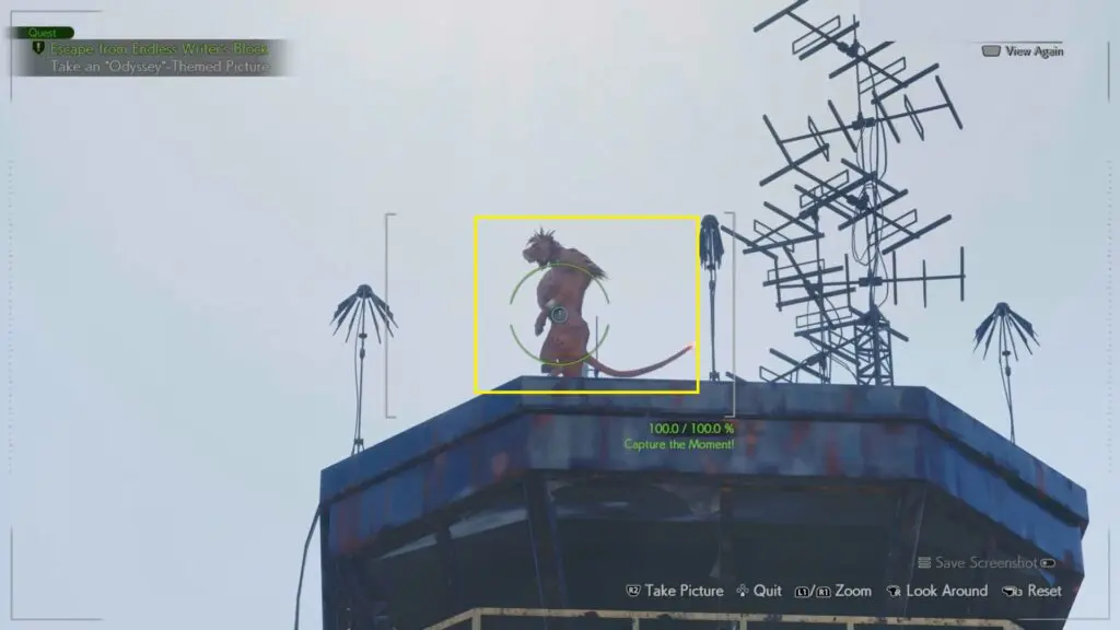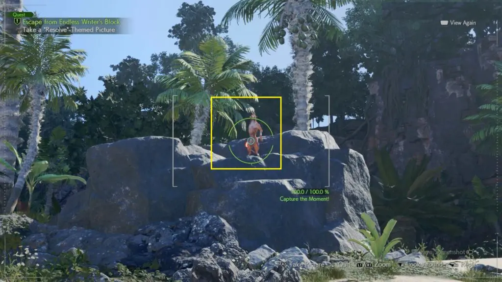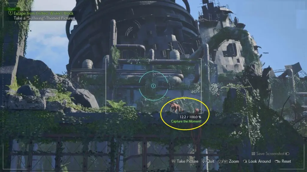 Go north to the Rugged Shoals and take a picture of Red XIII. For the best picture, snap him while he’s posing on a large boulder or a few other places, and ensure the percentage bar is 100%.