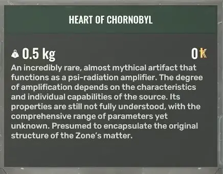 The Heart of Chernobyl is a unique artifact that can be obtained by looting Strelok during The Last Step mission.