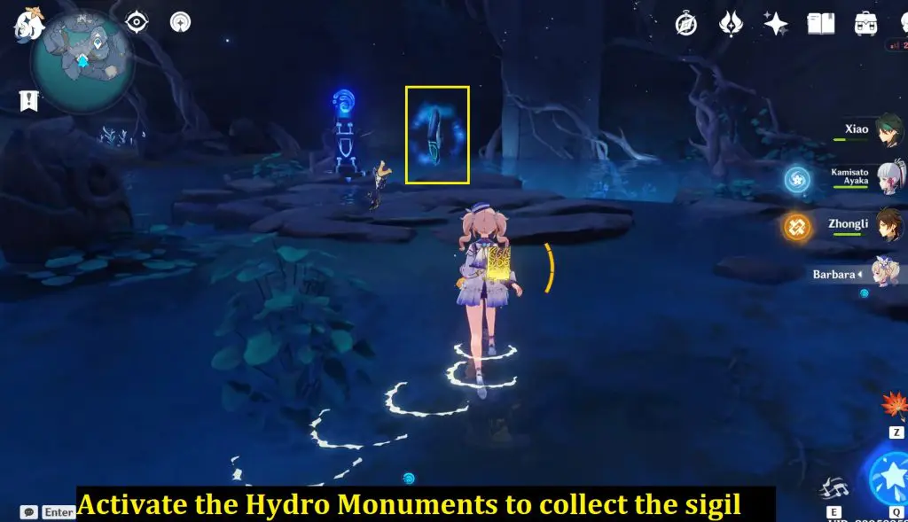 This key Sigil is Locked behind a barrier. Use the Teleport Waypoint nearby and use the Day-Night Switch Mechanism to switch to Evernight. Activate the Hydro Monuments to collect the sigil.