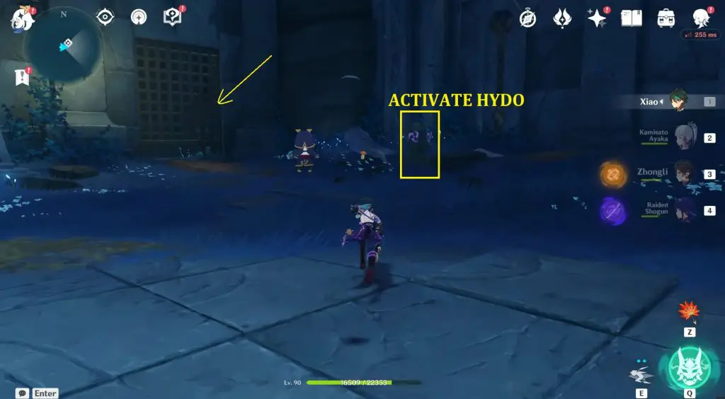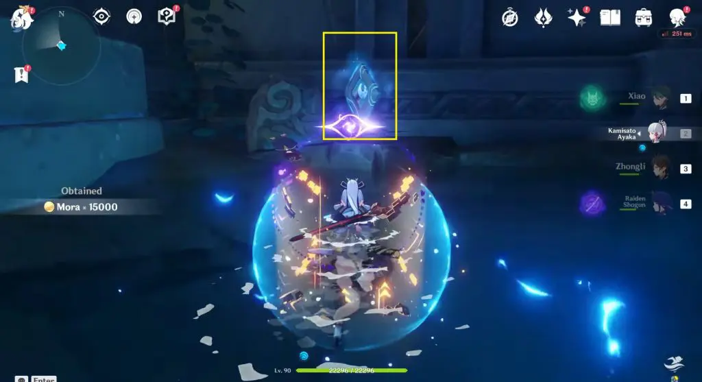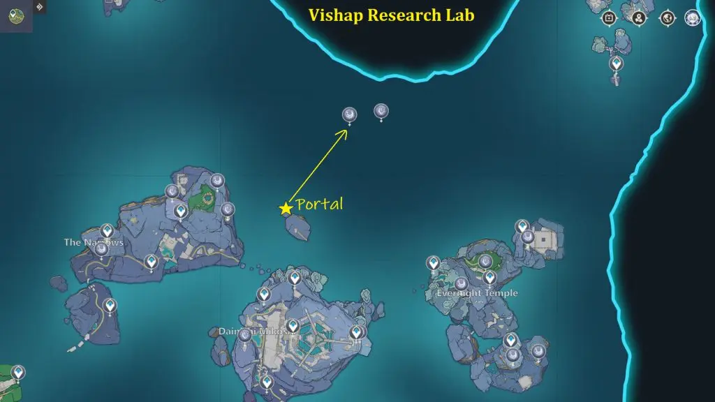 This is located on a hidden island named “Vishap Research Lab”. You can reach this island using Enkanomiya Phase Gate from Dainichi Mikoshi. I have marked the location of Enkanomiya Phase Gate on the map below. On the island go to the main area and activate the hydro pillar. This will open with an opponent. Defeat him and collect the Key Sigil from the room