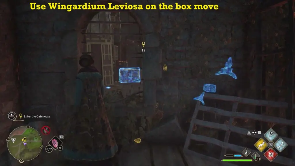 So, go around the building and look through a window. From the window use Wingardium Leviosa on the box move it and clear the crawlspace. Finally, you can enter the gatehouse.