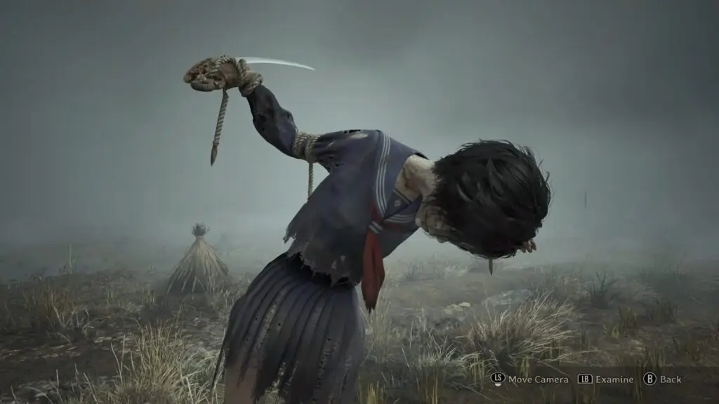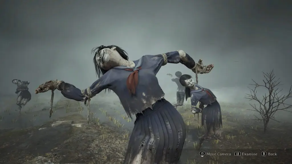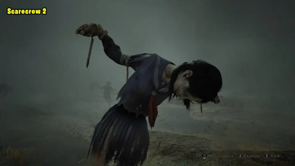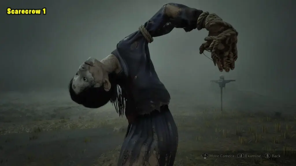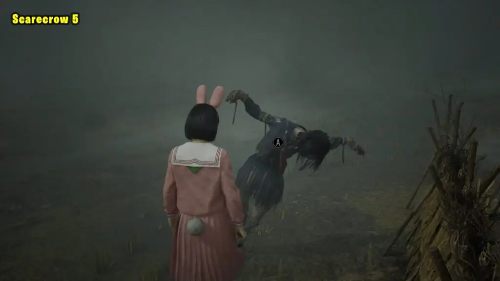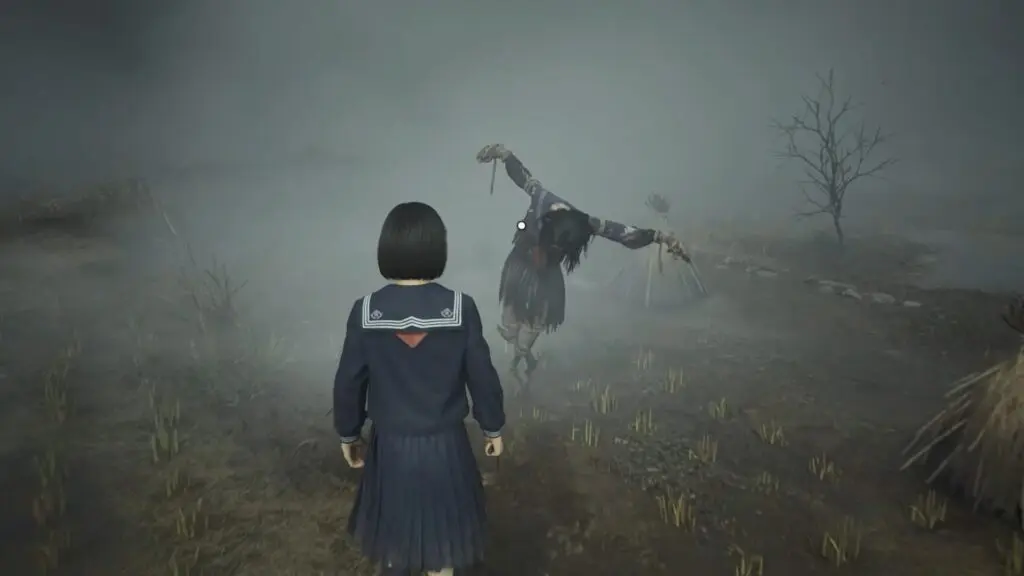 To solve the puzzle for the story’s difficulty level, you must find the right scarecrow in the field and take out the needle stuck in it. If you pick the wrong scarecrow, it will chase you. Once you pick the correct scarecrow, it will show the correct path you need to follow. The correct scarecrow is the one that resembles Hinako, with short hair and a red tie.