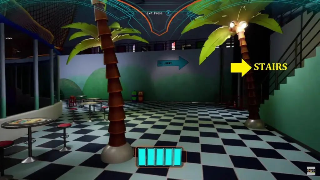 As the mission starts you need to jump and hide inside Freddy before Chia catches you. Freddy tells you to go upstairs. From the daycare go left and take the stairs near the sign that says “Lobby“. I have attached a screenshot for this.