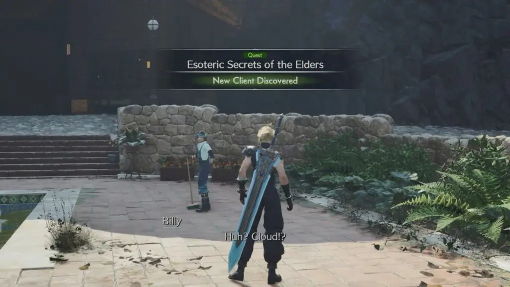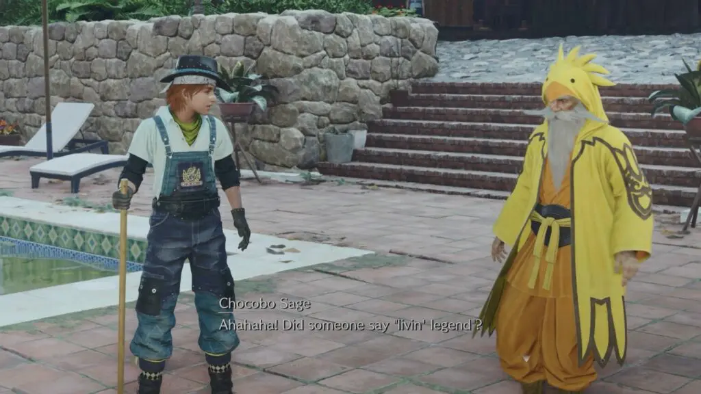 Head to the Chocobo Sage’s Manor in the southeast corner of the Nibel region. Speak with Billy (NPC) who is cleaning the floor to start the quest. He will ask for the favour to bring the lost Chocobo to his master Chocobo Sage.
