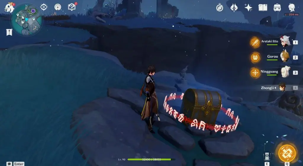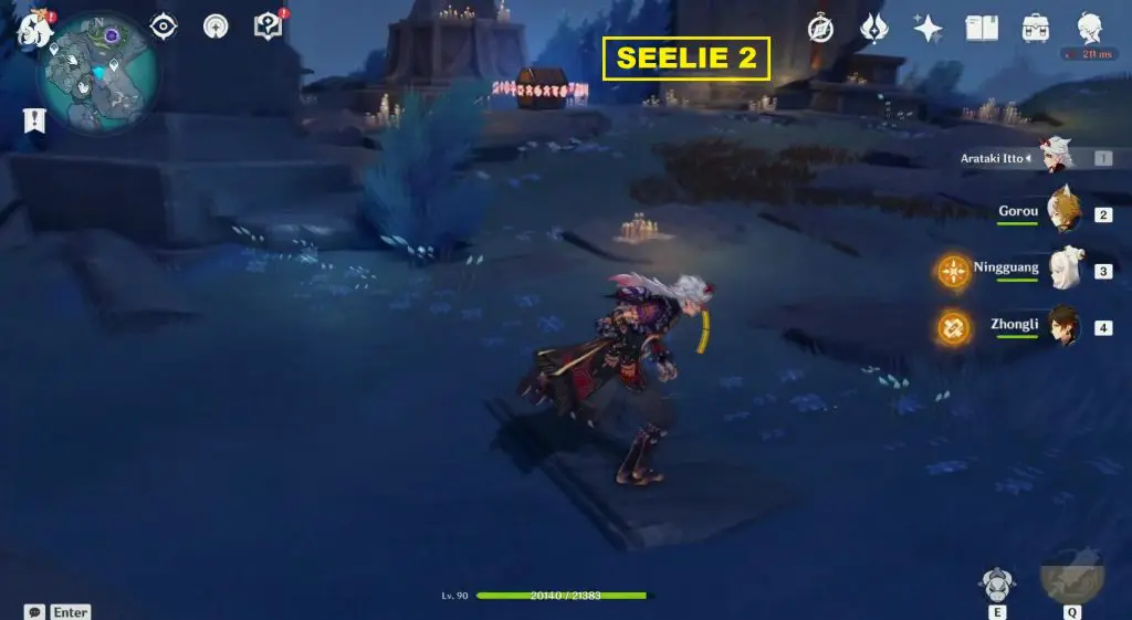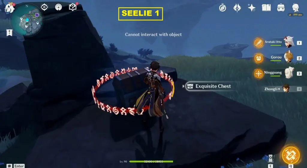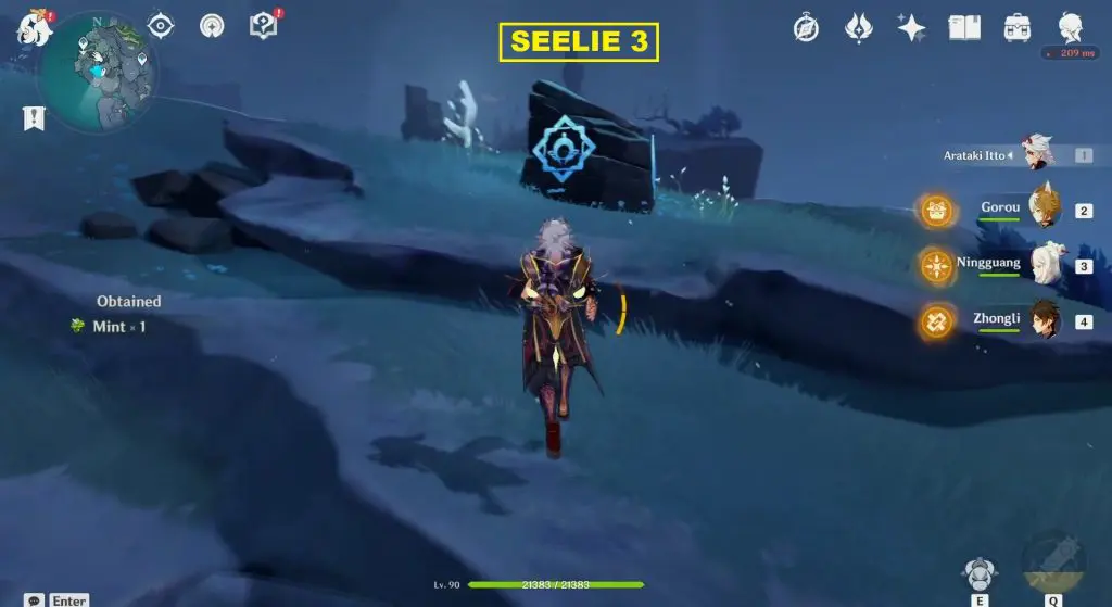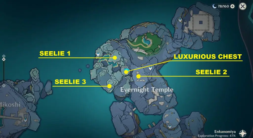 The location of the Seelie is marked on the map posted above. At the marked location, you will see a stone with three seals on it as shown in the picture below. Unlock the three seals using Key Sigils that you will find around Enkanomiya. This will make a chest spawn on top of the stone. Then open the chest and a Seelie will come out. Guide the Seelie to its court.