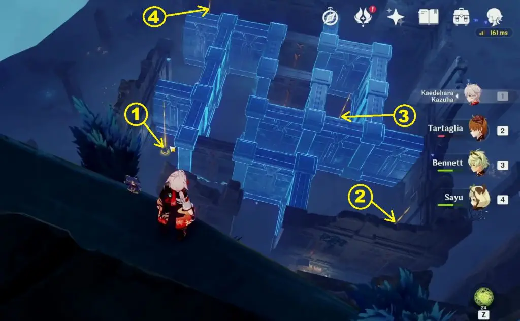 Go to the northeast side of Evernight Temple as shown in the picture below. If it is night (Evernight), then you will see a Labyrinth as shown in the second picture below. Inside the labyrinth, you will see 4 hydro pillars. But the pillars won’t be accessible as your path will be blocked. To reach them, you will need to solve the Labyrinth/ Maze Puzzle.