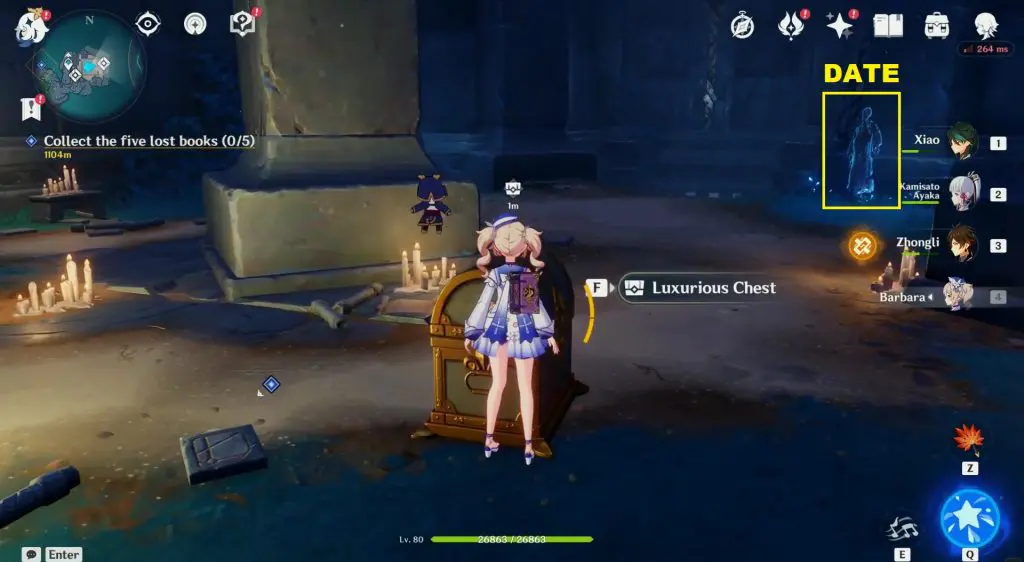 Now jump down the hole at the center of the labyrinth. Below, you will find a luxurious chest as shown in the picture below. Open the chest to get Date’s Medal of Recognition. Now talk to the ghost named Date, standing near the luxurious chest, to start the “Date’s Challenge” world quest. Date will also give you Date’s Key.