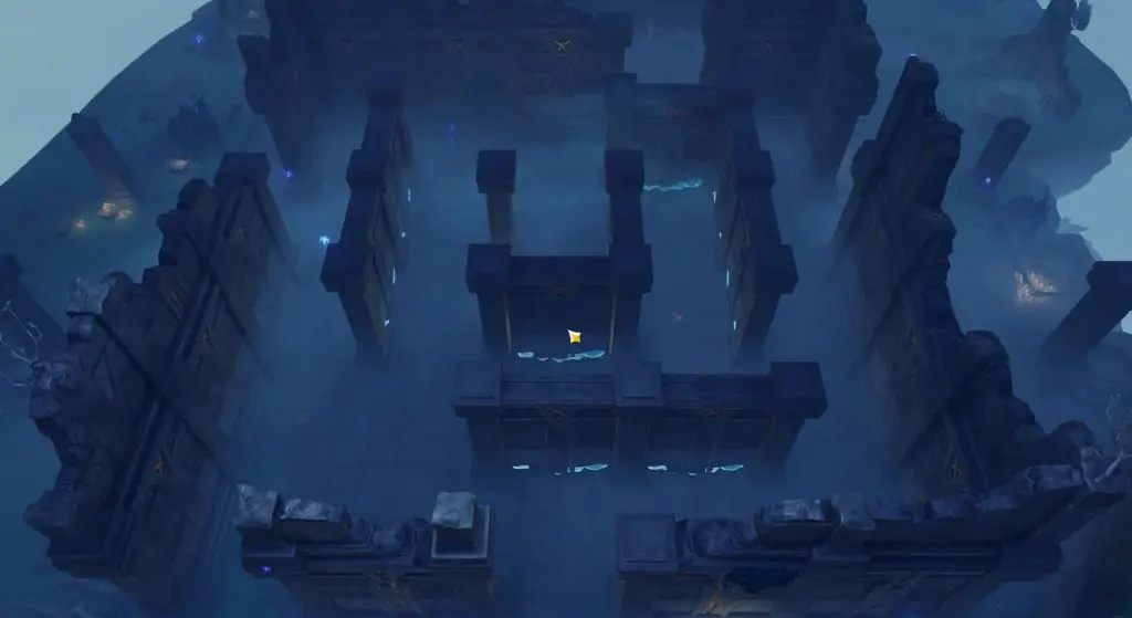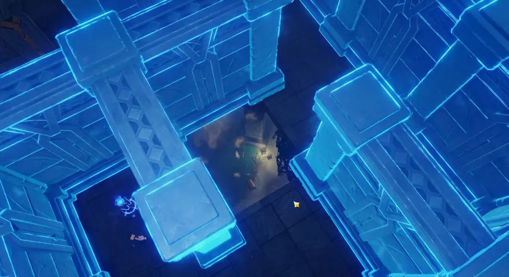 Now switch to Evernight by interacting with the switch. This will make the Labyrinth appear again, but this time all the 4 pillars inside the Labyrinth will be accessible. Jump down and go to all the 4 pillars inside the labyrinth and activate them by hitting them with hydro attacks. When all 4 pillars are active, the floor grating at the center of the labyrinth will open up as shown in the picture below.