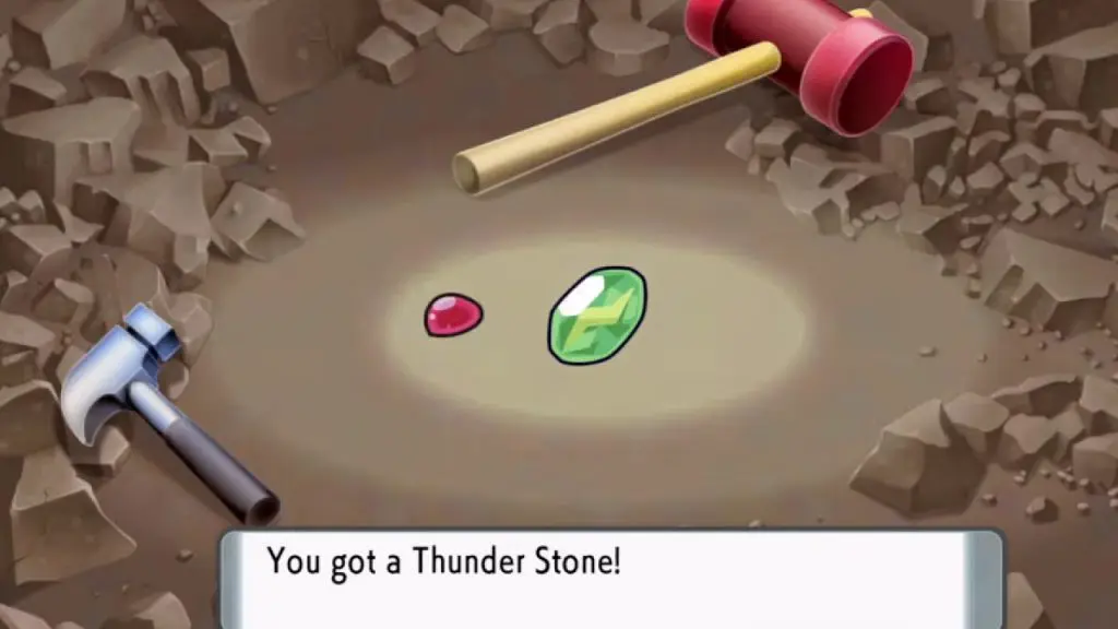 Thunder Stones can be obtained by digging out the bulging walls found in the Grand Underground.