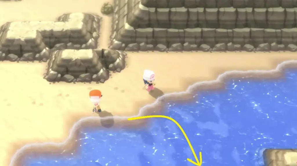 Pass through Pastoria city and make your way to Route 213. Make your way down to the beach. On the right, you will find a fisherman. From here start surfing downwards into the rocky water and then make your way to the right. Then go up past the double battle to grab the water stone.