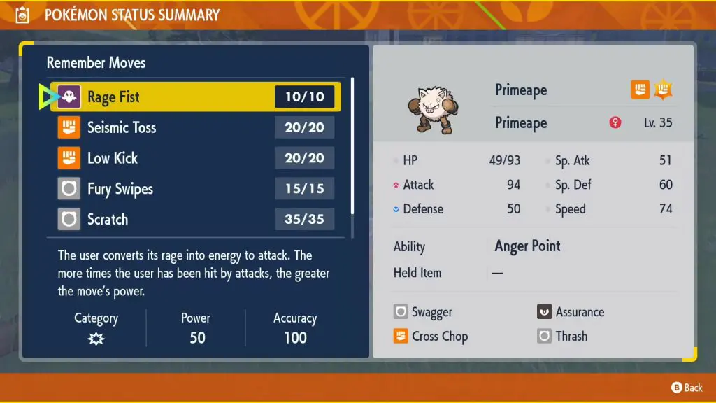 Once the Primeape reaches level 35, you will be able to teach it the Rage Fist move as shown in the picture below. Now you will have to use the Rage Fist move 2o times to evolve Primeape into Annihilape.