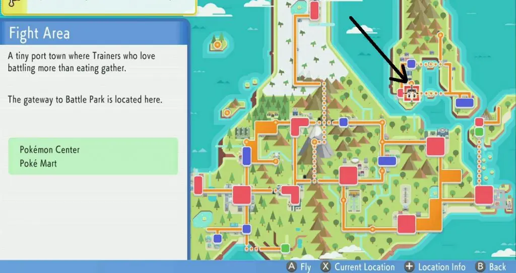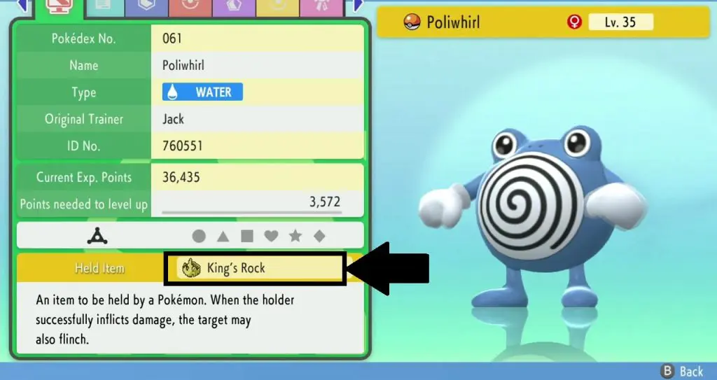 To get King’s rock, you will need to fish a Poliwhirk with a King’s Rock as shown in the picture below. You will be able to catch Poliwhirl using Super Rod. Click here to see how to get the Super Rod. Once you have the Super Rod, go to the water in Route 225 as shown in the second and third pictures below. Now fish for Poliwhirl until you catch one with a King’s Rock.