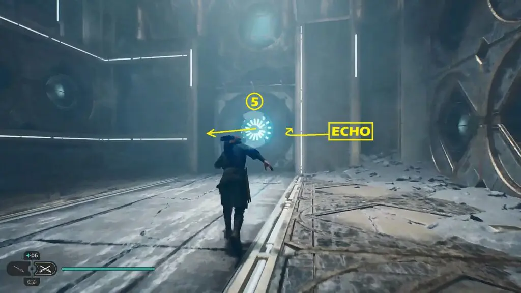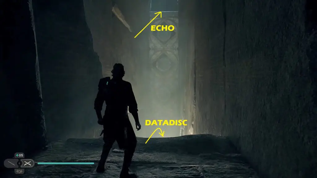 Proceed ahead and you will reach the location shown in the picture below. Drop down to find a Datadisc. Then run on the walls and bounce off them to get higher to reach the top as shown below. There you will find the echo right in front.