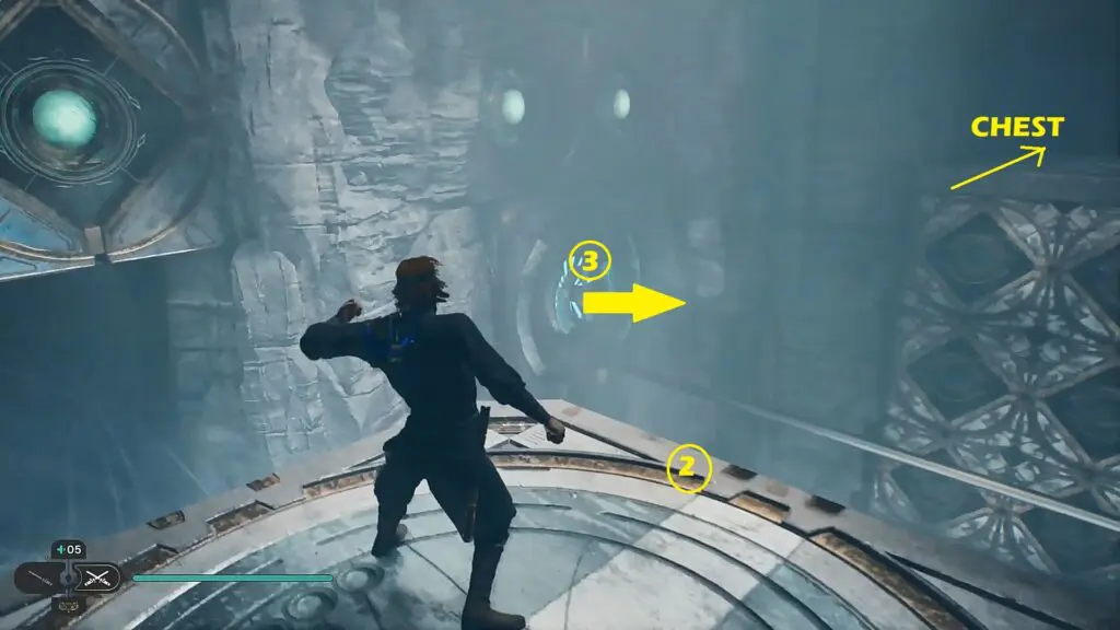 Proceed ahead until you reach a gap on the path. Pull out Block #2 as shown in the picture below and jump onto it. Then pull out Block #3 from the left side as shown in the picture below. Jump onto it to reach the other side. Then proceed ahead to find the chest.
