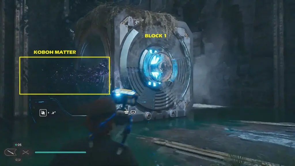 When you pulled Block 1 previously, it went to the opposite wall. There is Koboh Matter on this wall as well. Throw Koboh Matter on Block 1 and connect it with the Koboh Matter on the wall as shown in the picture below.