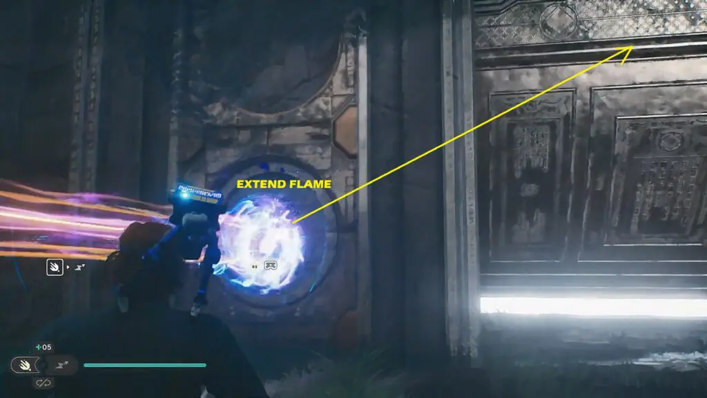 Now pull Block 1 such that the Koboh Matter on it burns from the flame. Now quickly push it back. The flame on Block 1 will burn the Koboh Matter on the wall as shown in the second picture below.