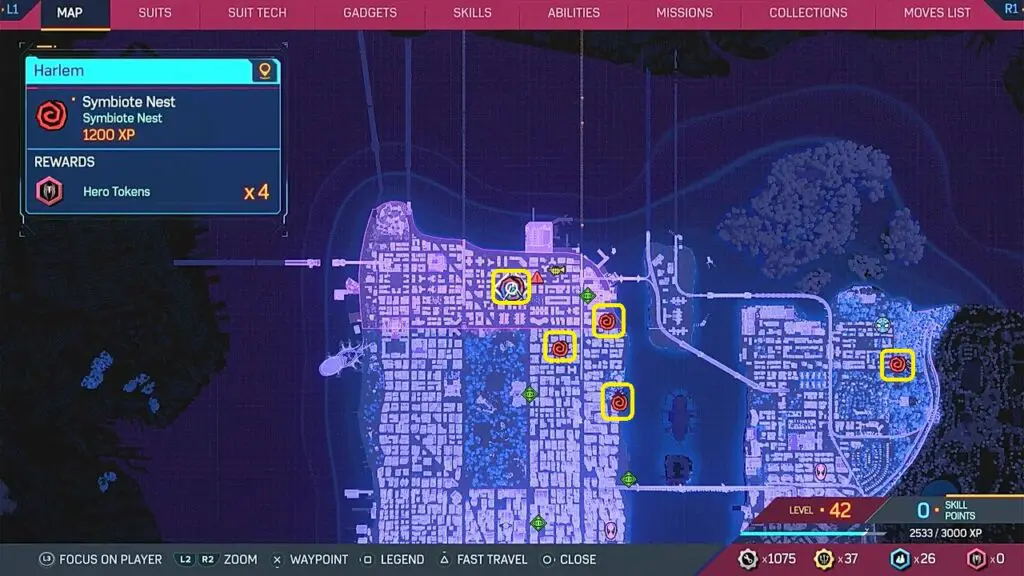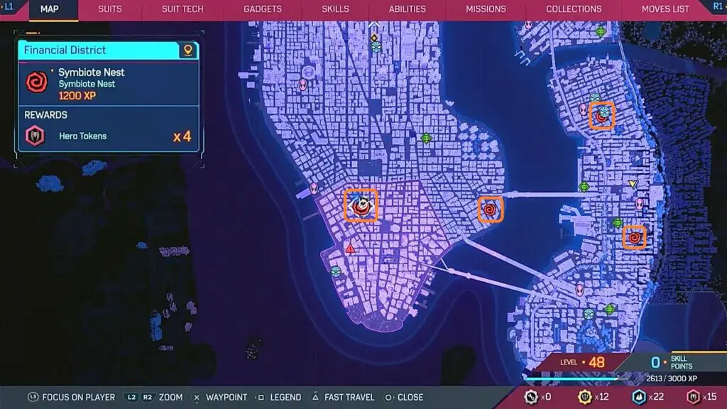 Locations of all 10 Symbiote Nests are shown in the pictures below. Symbiote Nests in Harlem, Upper East Side, and Astoria unlock after Main Mission 26 (Marked with yellow squares in the picture below). Symbiote Nests in the Upper West Side, Chinatown, Financial District, Williamsburg, and Little Odessa unlock after Main Mission 28 (Marked with orange squares in the second and third picture below).