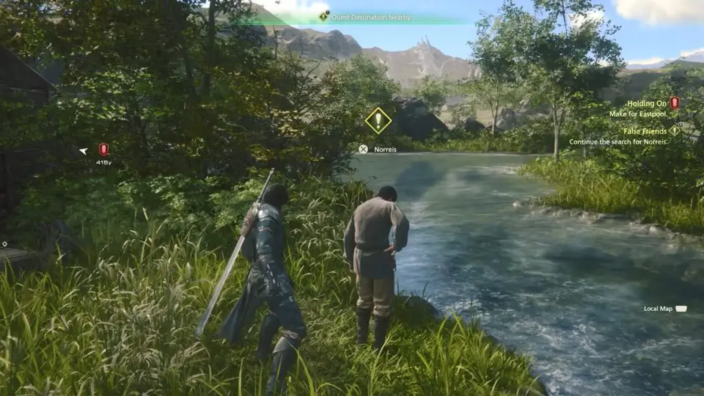 Continue searching for clues in the area by following the quest marker. You’ll come to an old deteriorated wooden house. Speak with Norreis, who is standing along the water’s edge.