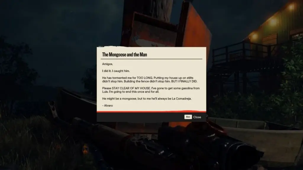“The Mongoose and the Man” is a Treasure Hunt In Far Cry 6. In “The Mongoose and the Man”, a player needs to hunt down a Mongoose to get the access key of the chest. There are no pre-requisites for Treasure Hunts. A player just needs to head the purple treasure hunt icon and need to read the note that starts the treasure hunt.