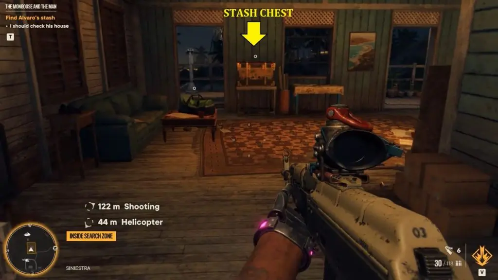 Head to the second floor of the main wooden building and go to the living room to find a locked stashed chest. This stashed chest requires a stashed key that you can obtain from the mongoose.