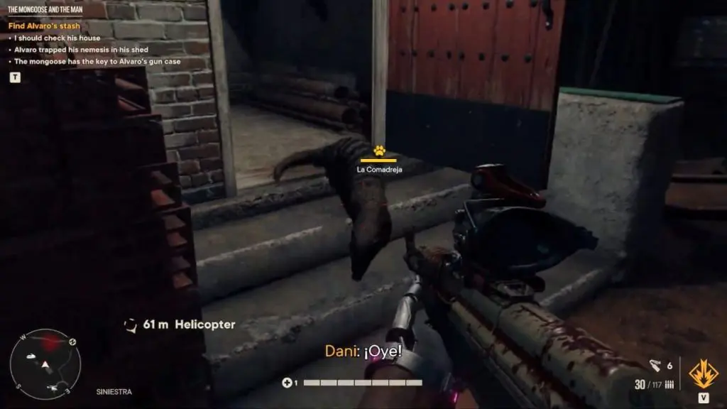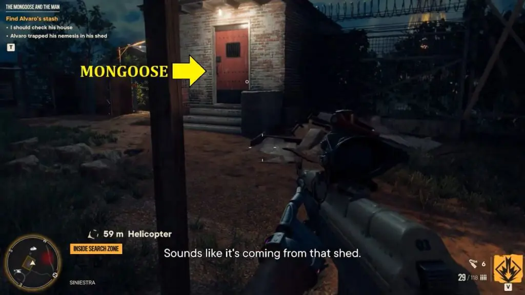 To find the mongoose, you must now enter Alvaro’s premises. You can enter by jumping over the fence right next to the letter-carrying pole. You can also shoot the lock on the fenced gate on the southern side.