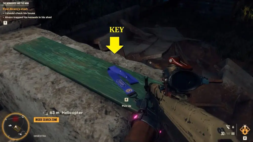 Head towards the shed behind the main building and use the key in front of it to open. As you open the door The Mongoose runs away. Chase the mongoose and shoot until it is dead. Obtain the stashed key from the dead mongoose.