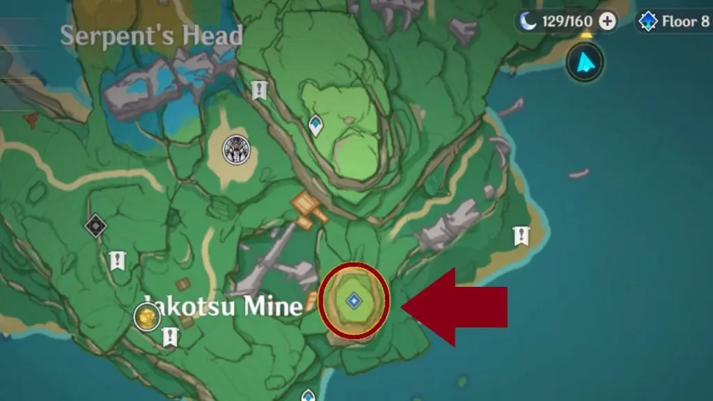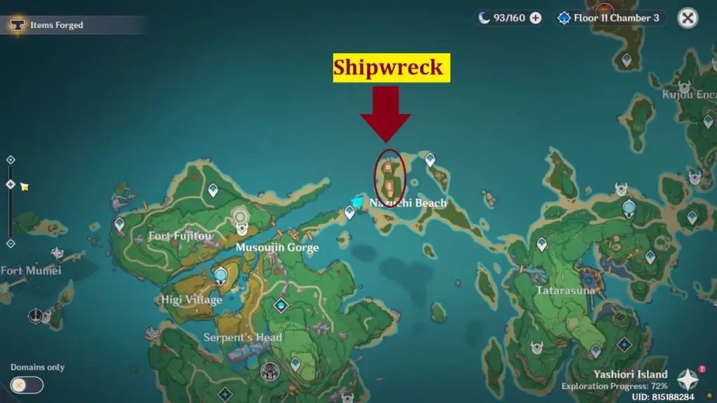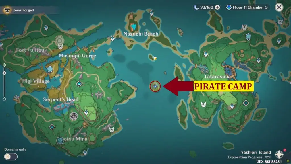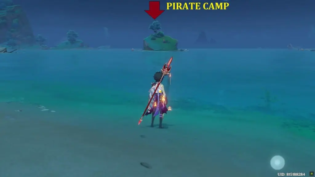 The pirate camp is south of Nazuchi Beach on a small island. I have marked the location of the pirate camp on the map given below. There is no Waverider Waypoint nearby, so players have to swim up to the island. Using Mona or Ayaka can help you get to the pirate camp faster. In case you are losing stamina fast, then you can open your inventory and restore it by consuming some food items.