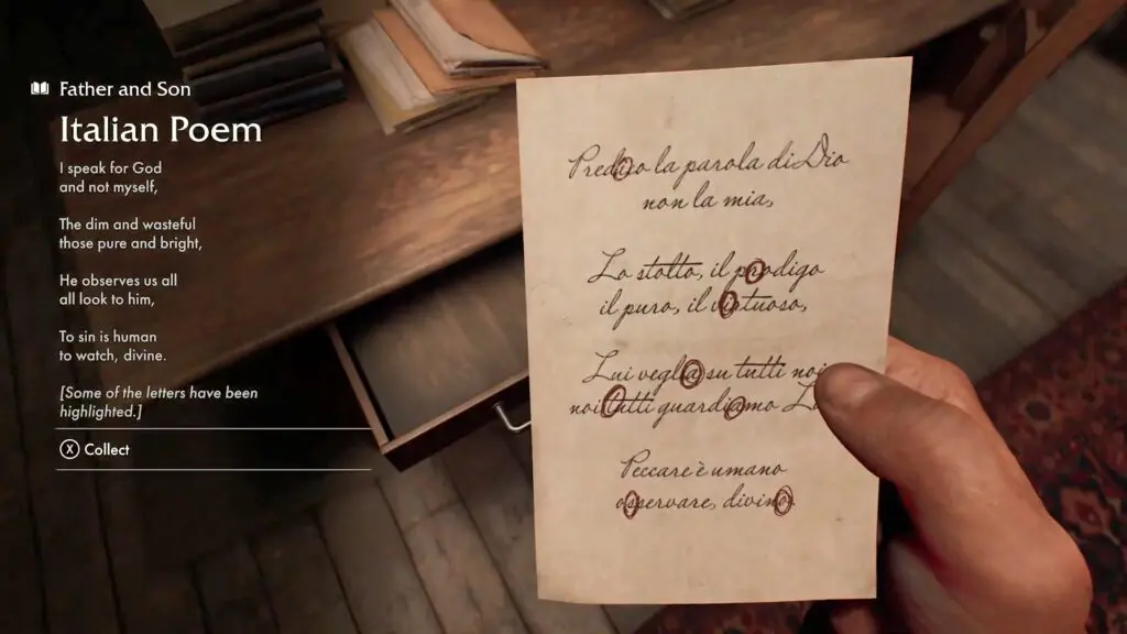 Head into the room and open the table drawer. Interact with the note- Italian Poem inside the drawer to start the mystery sidequest. This Italian poem has certain letters circled.