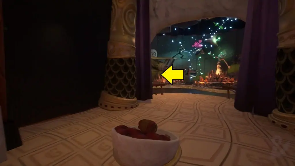 After obtaining the tag, proceed to the statues of Ford and Maligula in the adjoining room where the royal family statue is located. A secret room can be found beneath Maligula’s feet. Follow the track in and complete the go past the fast rotating platforms using Time Bubble. The Hatbox can be found at the end.