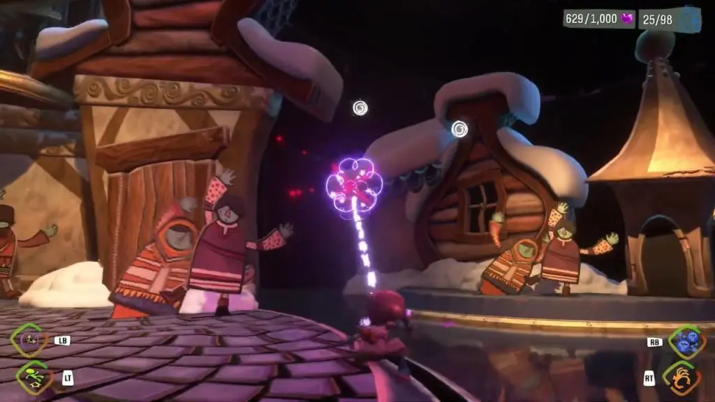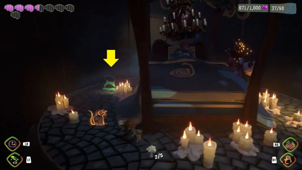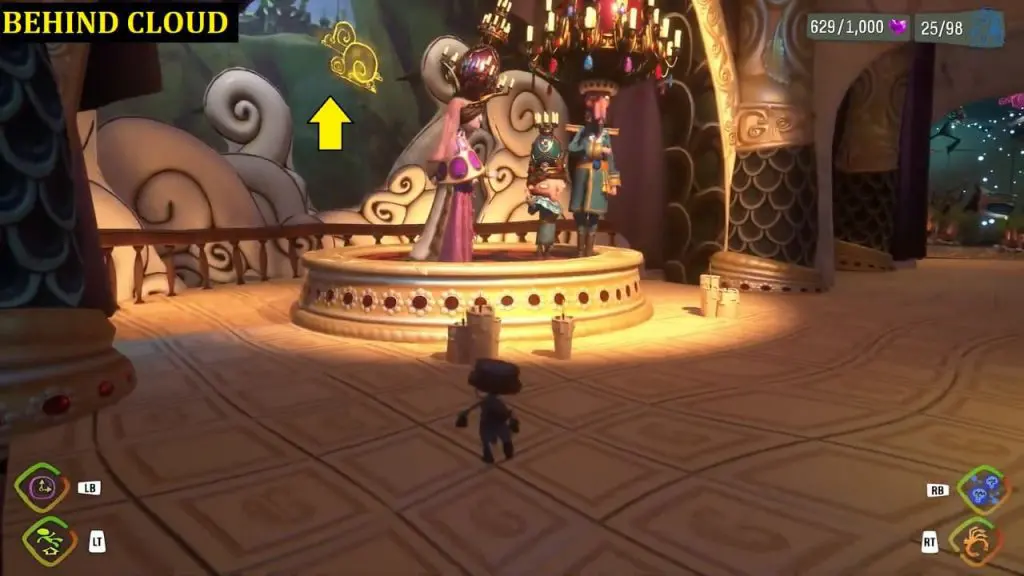 After getting down from the first ride, look for the Mental connection bubble and use it to ascend to the higher level of the building containing the royal family statue. Go behind the clouds and use rope trampolines to get to the top, where Hatbox Tag can be found.