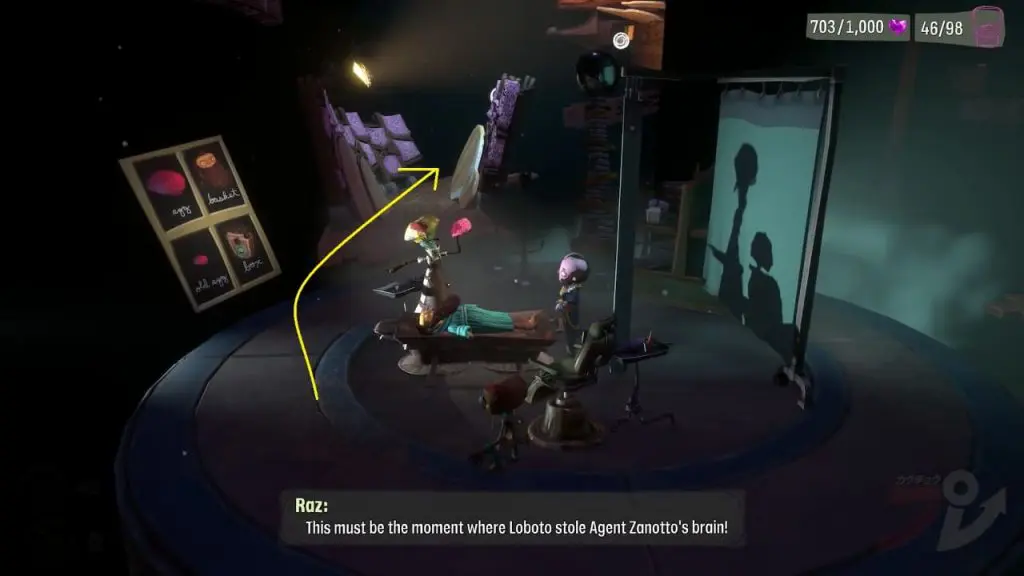 The Steamer Trunk can be found on the ride’s Whispering Rock section. You’ll find yourself in an open area, fighting enemies in front of fans. After the battle, enter a small door with a red bulb to access a new area. Follow those Mental Connections until you come across a memory of Loboto stealing the brain of agent Zanotto. To find the tag, follow those Mental Connections behind them.