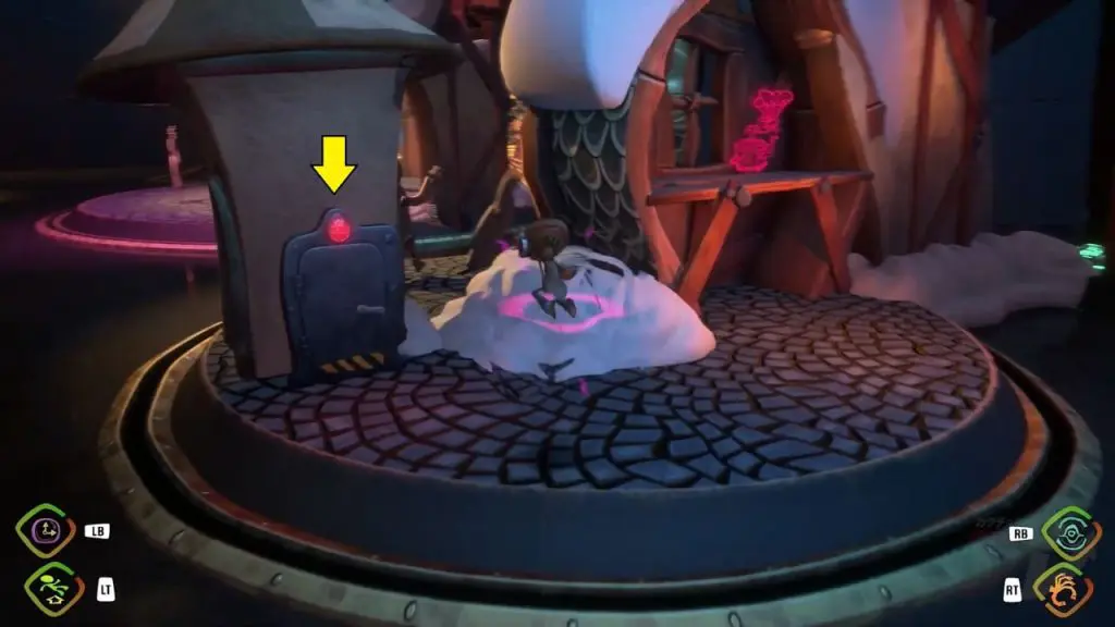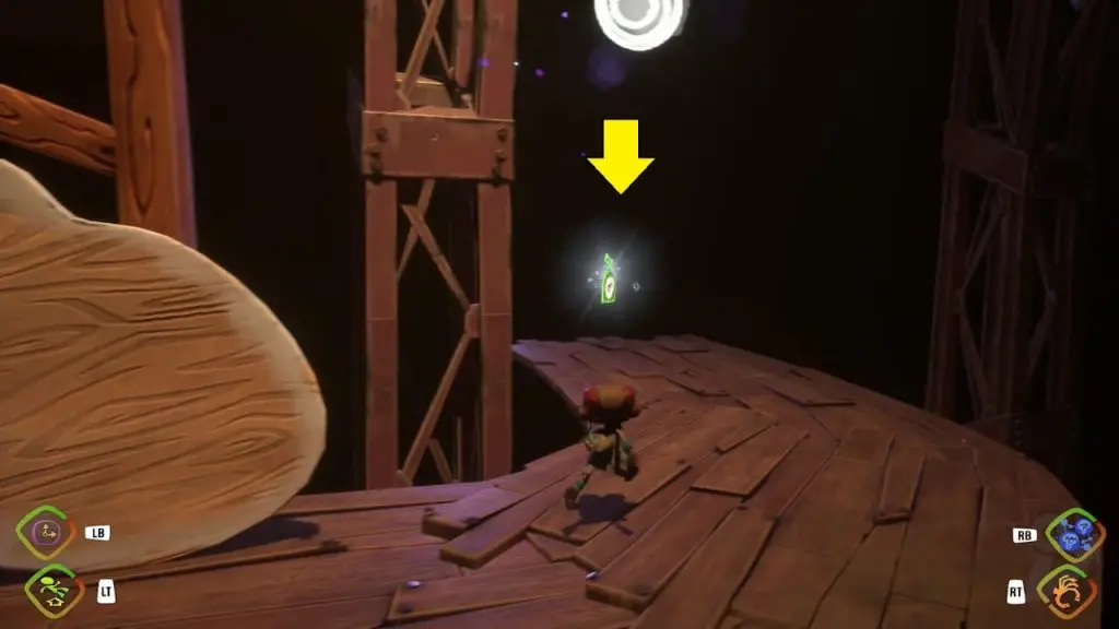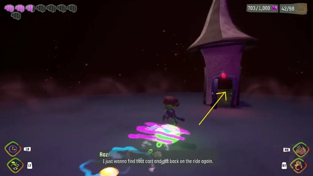 There is a small door with a red bulb near the end of the first ride. Enter a new room by going inside the door. Destroy the glittery wall inside the room. Use the Dark Thought upgrade for your Mental Connection power to get to the end of the wooden platform with the Tag on it.