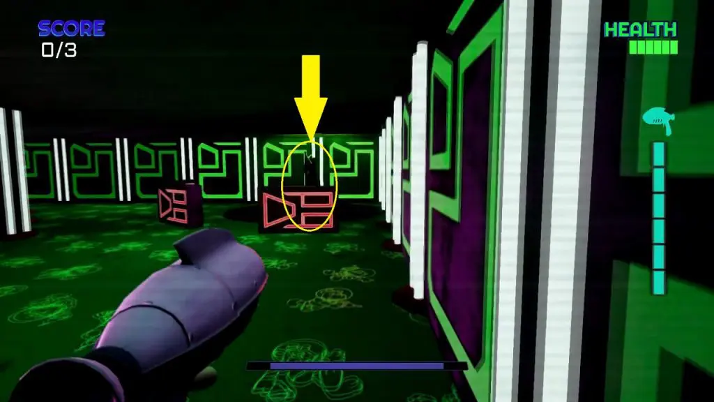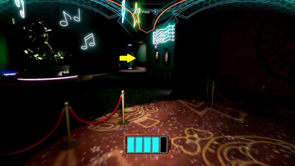After entering the parking, turn left and go straight. Go through the shutter door at the end of the parking, to reach the next room. In this room, you will find a save point and a recharge station next to it. Enter the recharge station to get inside Freddy’s Costume. Then continue ahead to reach the big hall in Level 1. The entrance to Fazer Blast is behind the Rocket Statue in the main hall as shown in the pictures below. Go through the Shutter door next to the Fazer Blast Logo to enter the Fazer Blast.