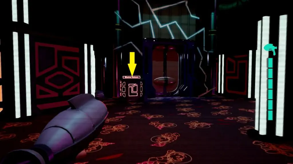 Inside Fazer Blast, use the Party Pass to enter the elevator. Take the elevator to the lower level. Here you will have a save point. Go through the door next to the save point. Keep moving ahead and after two more doors, you will reach an area with a gun kept on the table as shown in the picture below. Pick up the gun and keep moving ahead. Go through the hallway and enter the elevator at the end. Enter the elevator to reach the Fazer Blast Arena.